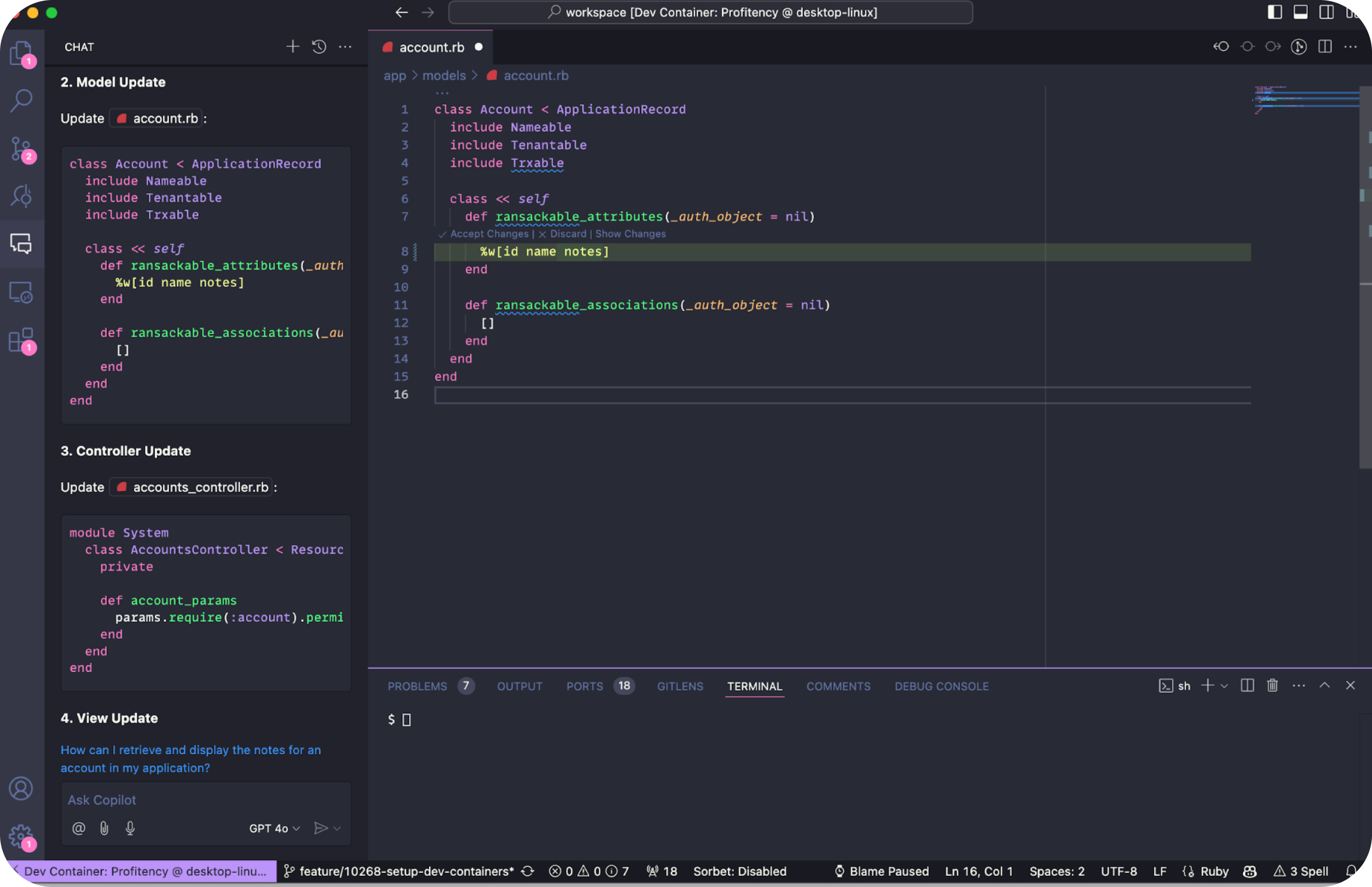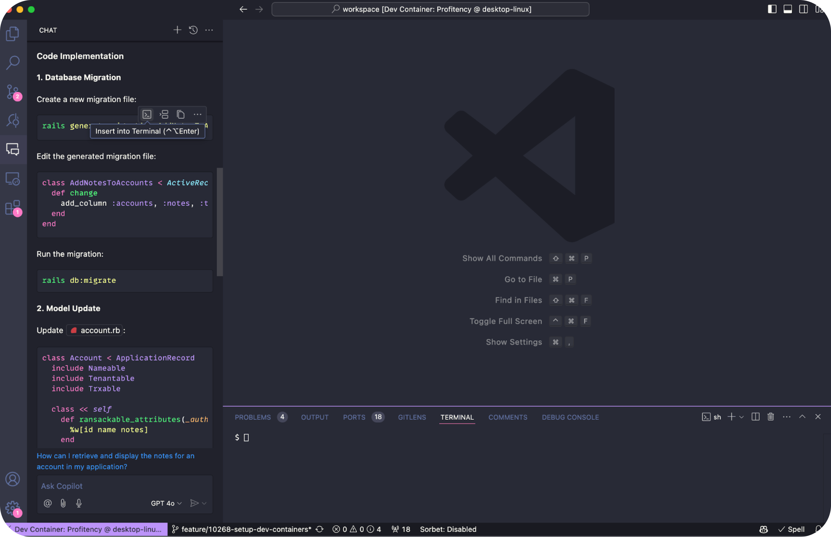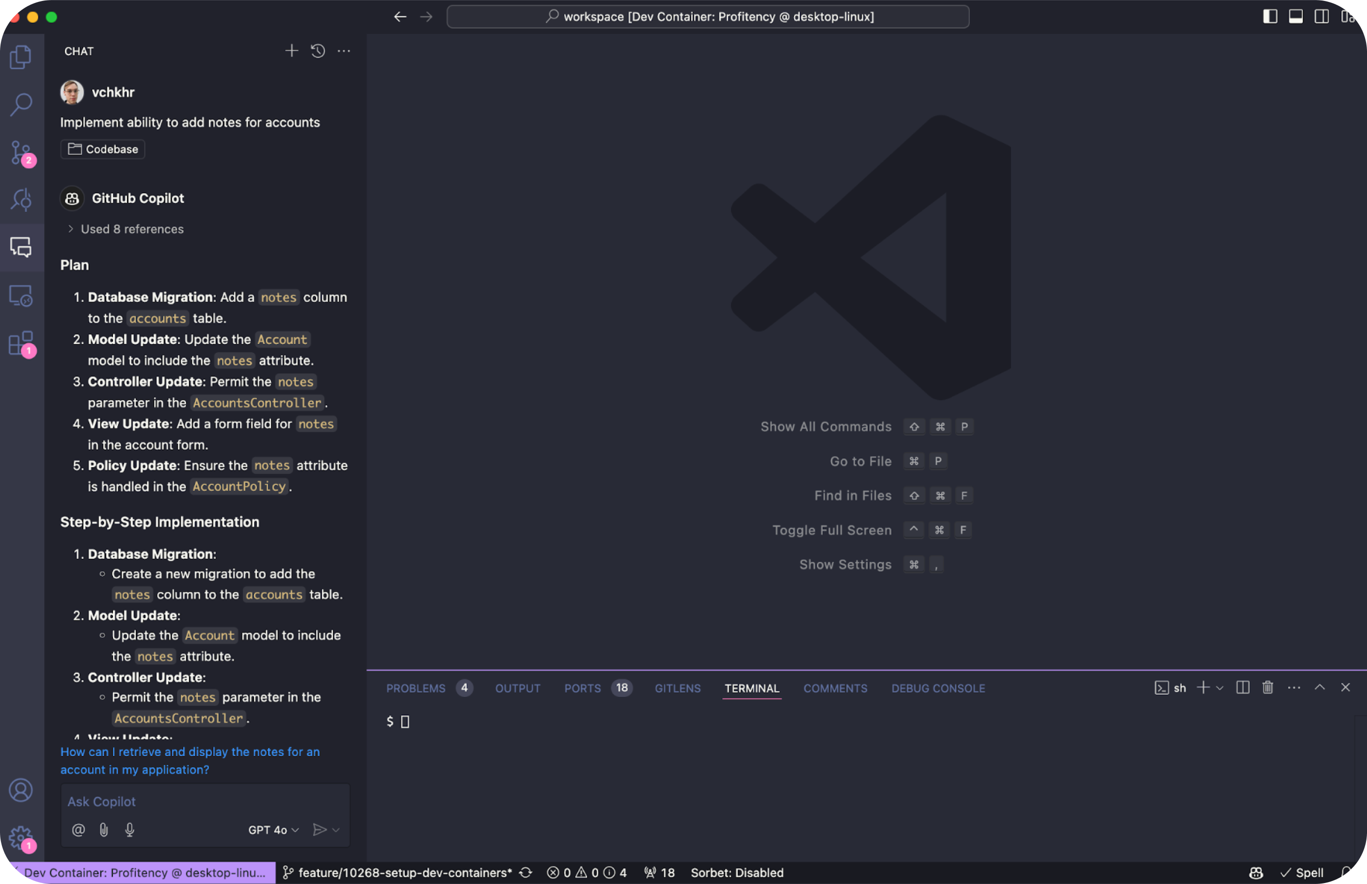 Using the @workspace command to attach the entire project’s codebase, I prompted: "Setup Dev Containers."