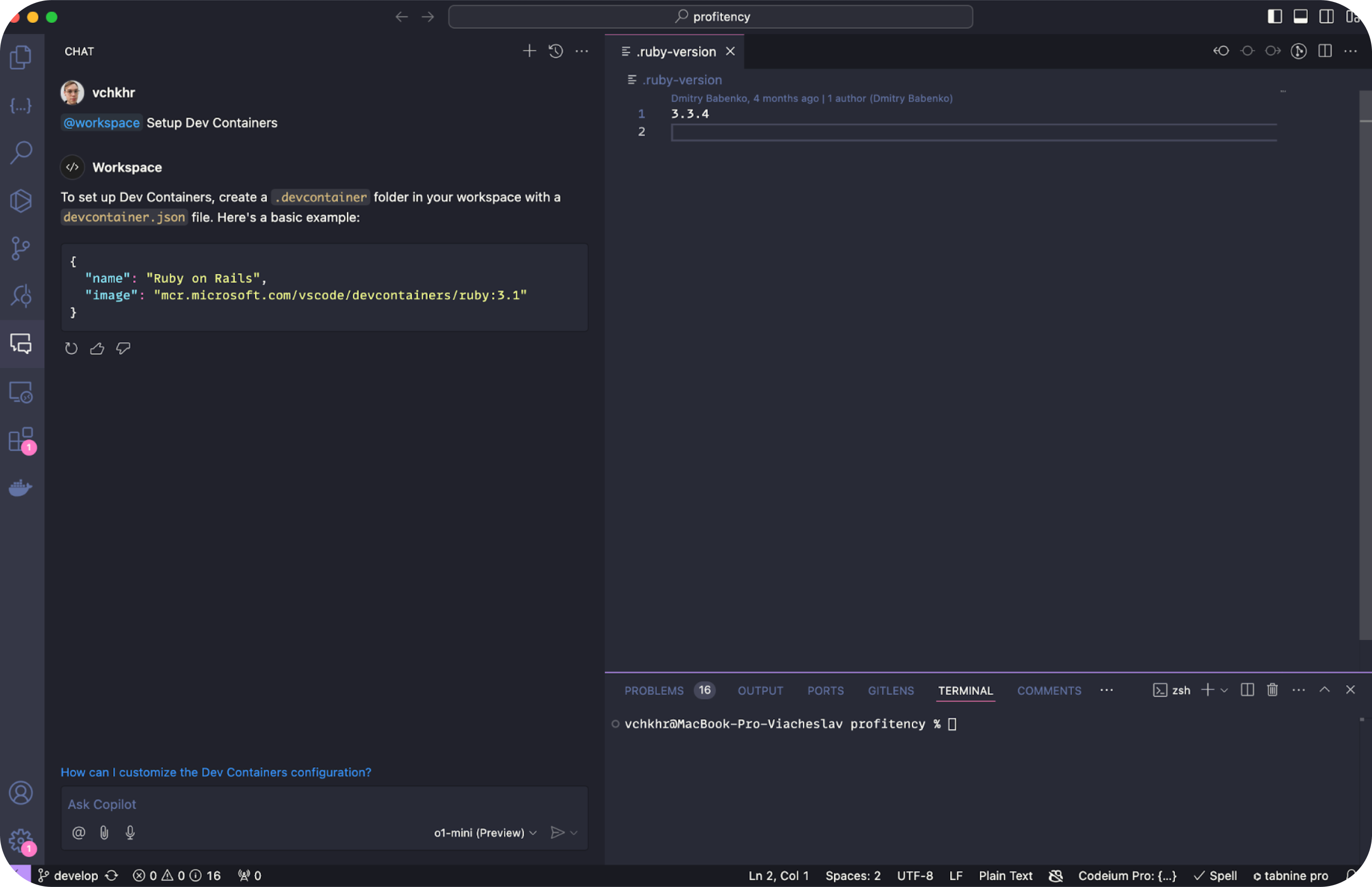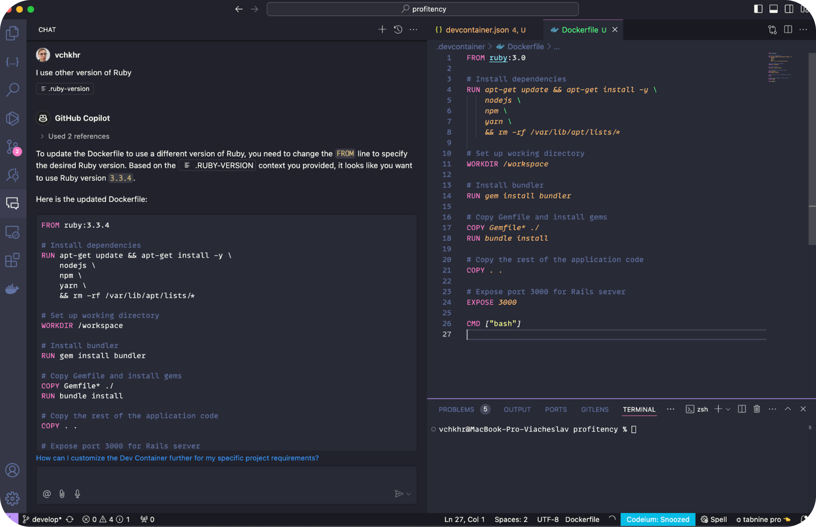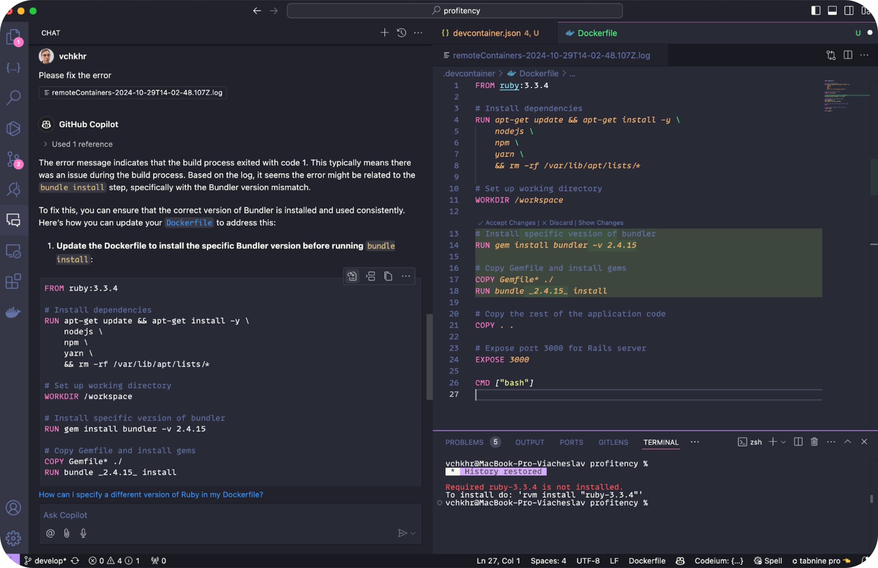 Also, the memory ran out at some point, and Copilot transferred the Dockerfile using Ruby 2.7, forgetting that the project uses Ruby 3.3.
