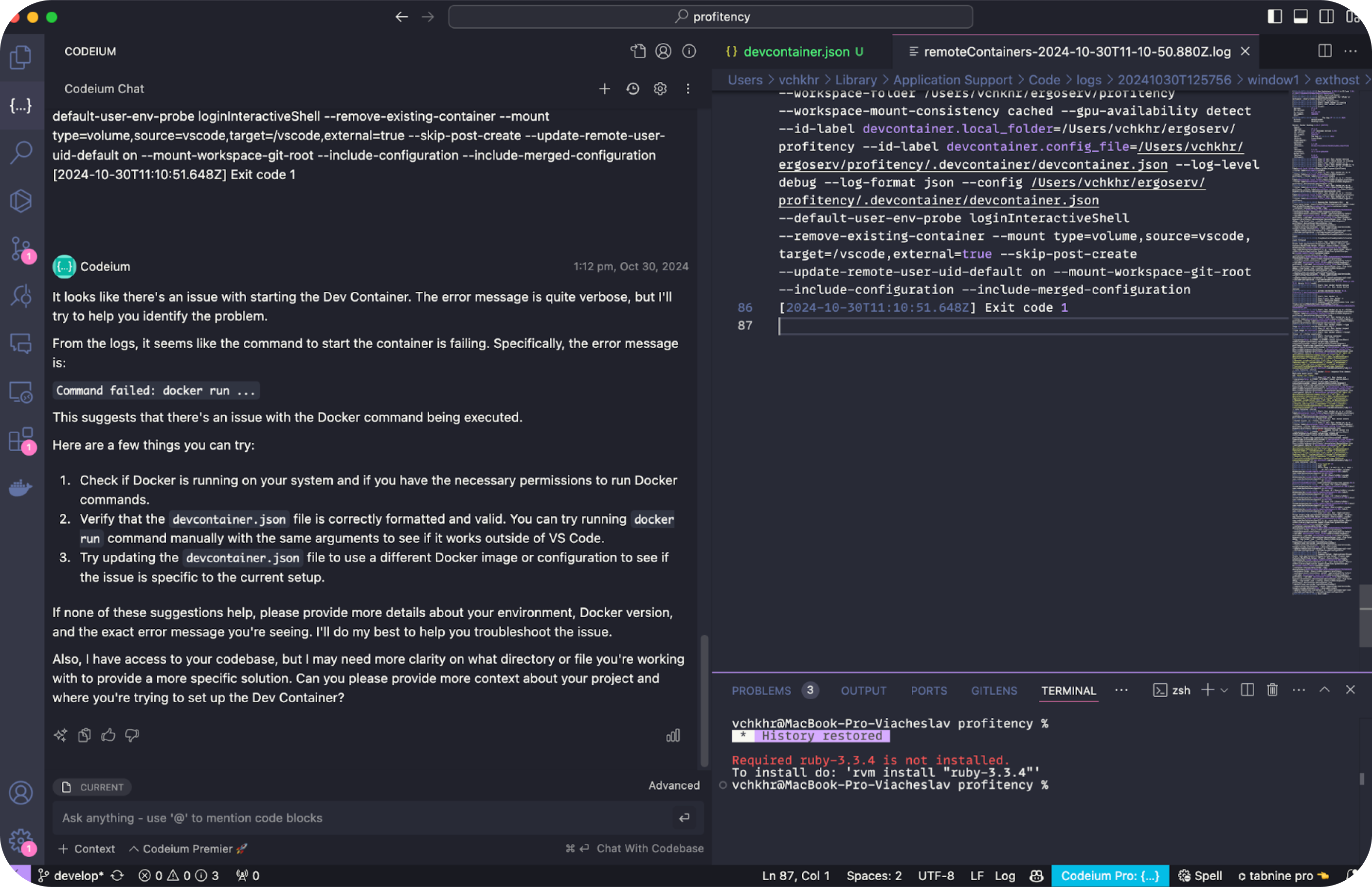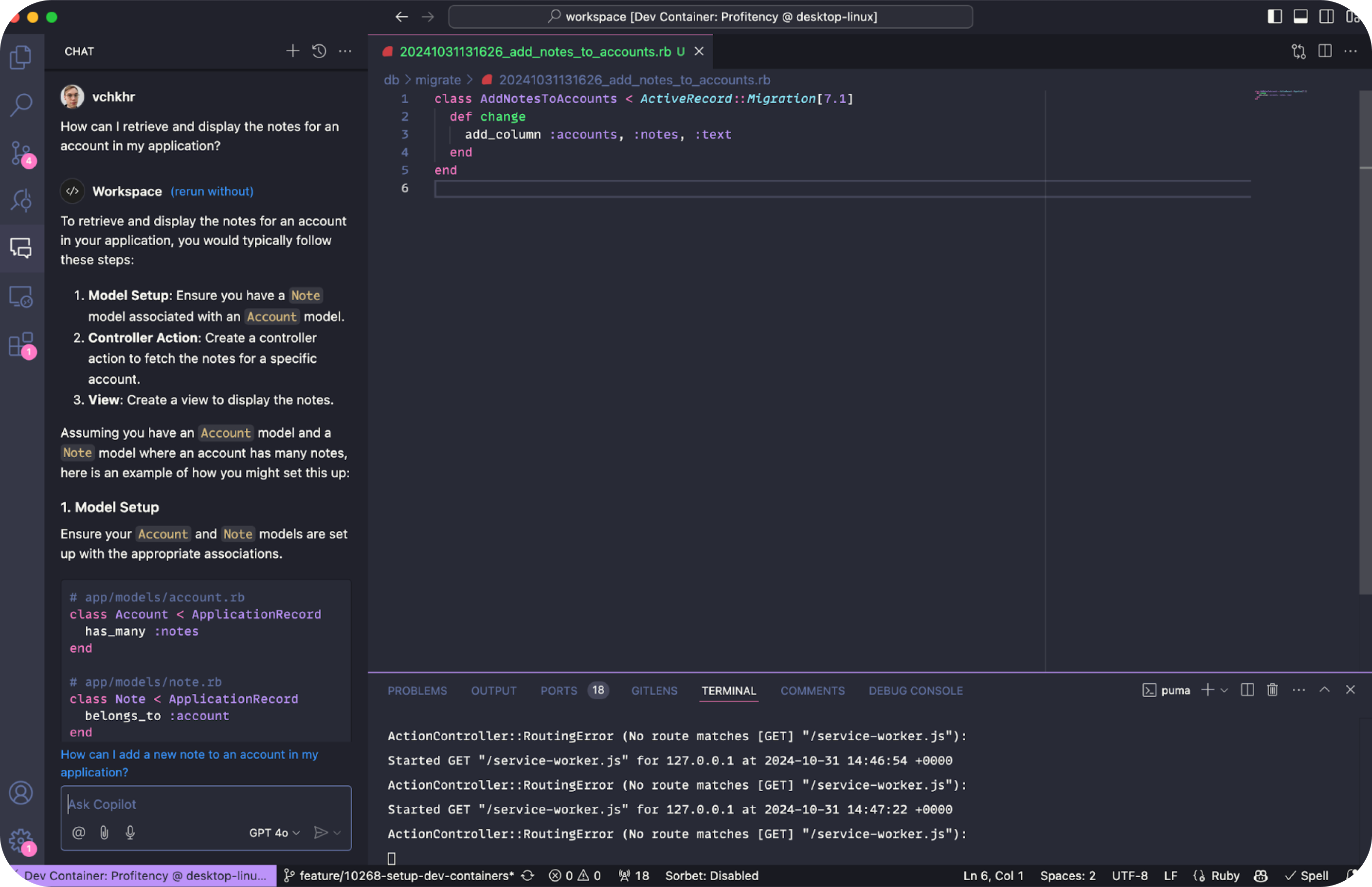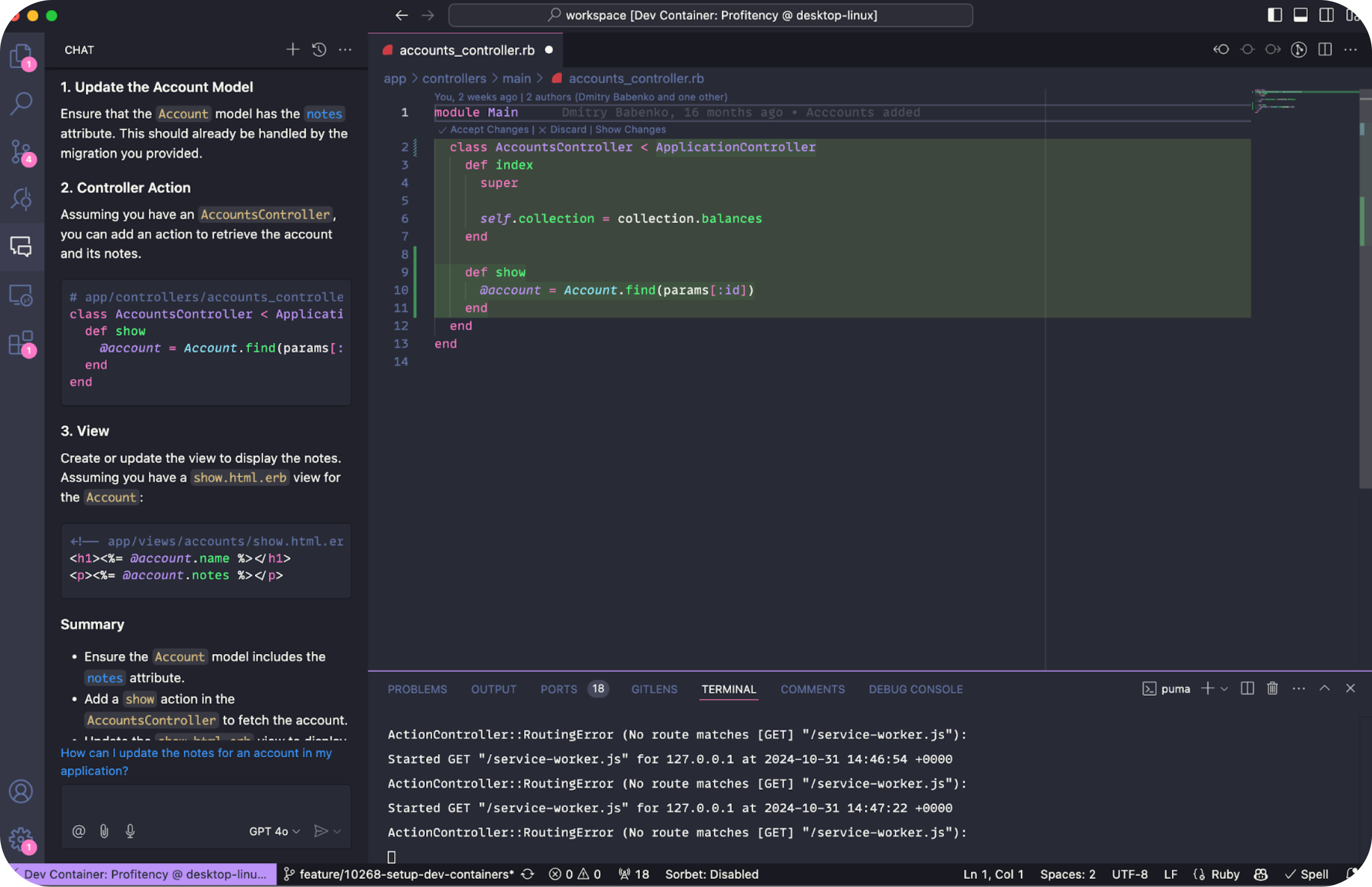 Also, the memory ran out at some point, and Copilot transferred the Dockerfile using Ruby 2.7, forgetting that the project uses Ruby 3.3.