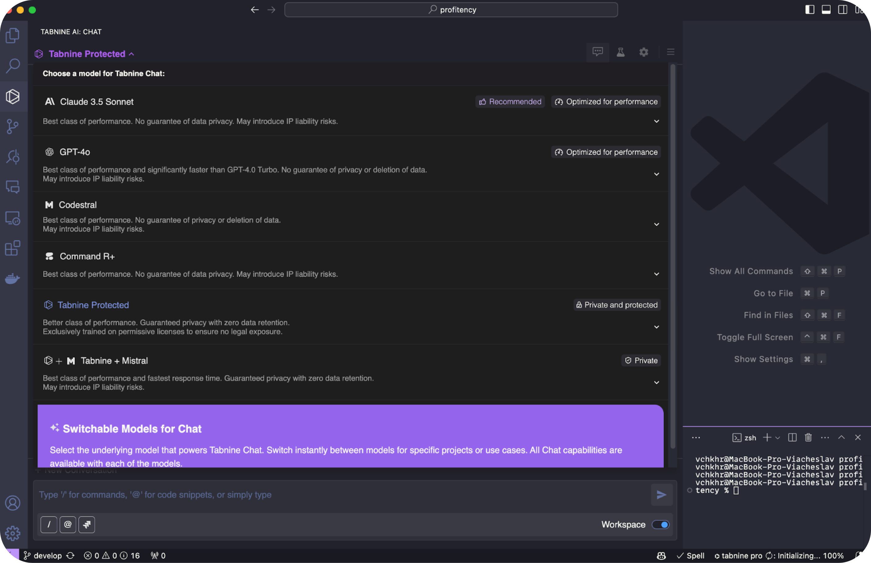 ➡️ Tabnine allows switching between models, offering options such as Claude 3.5 Sonnet, GPT-4o, and others: