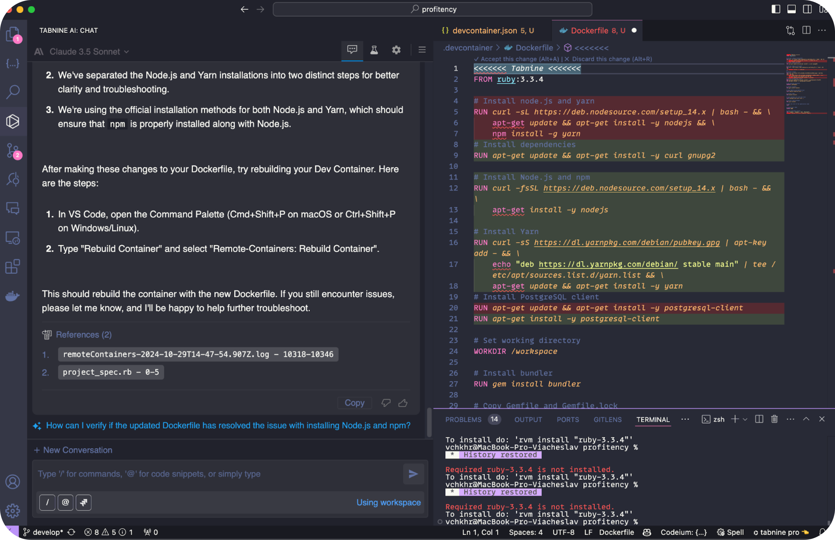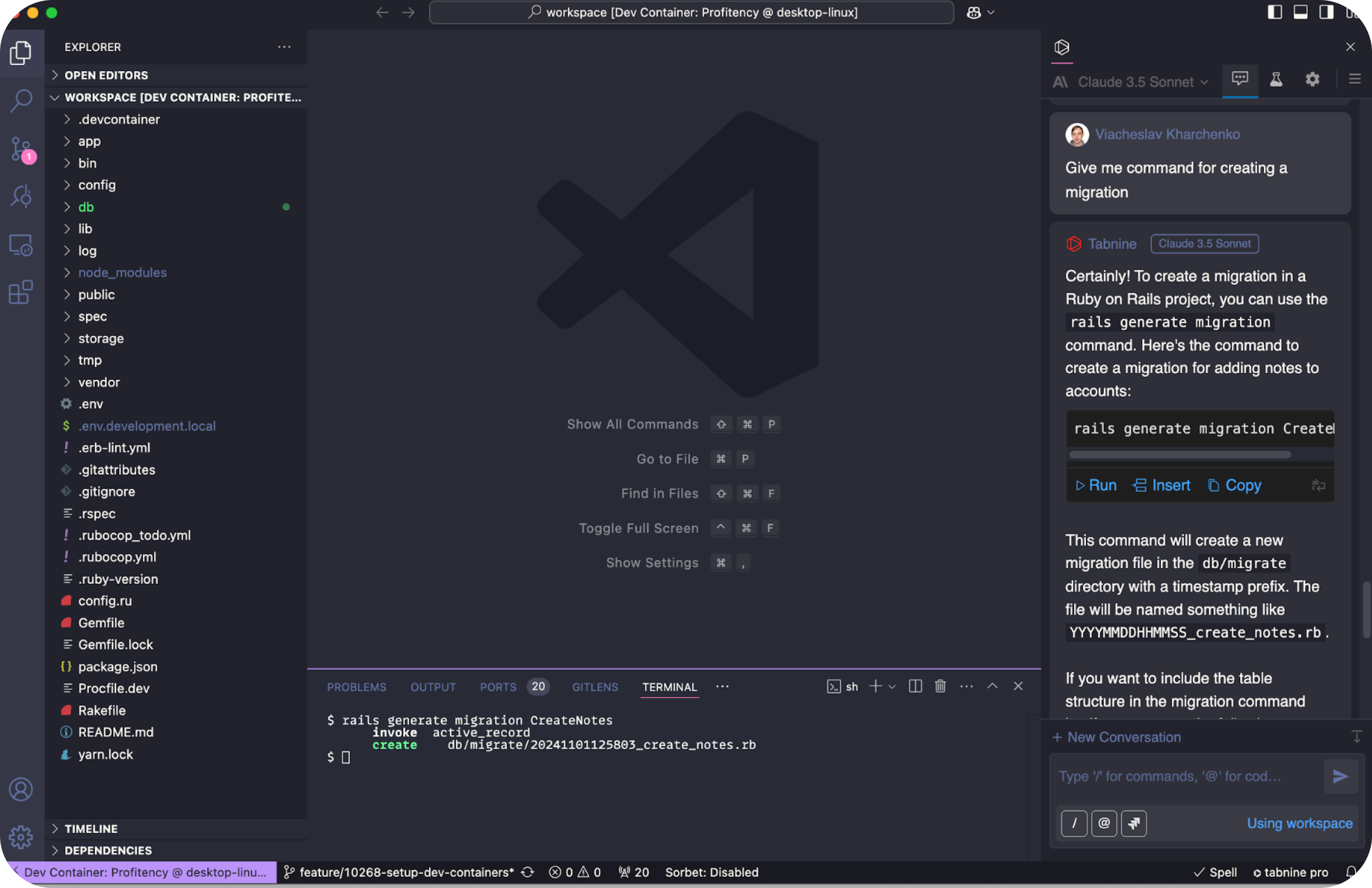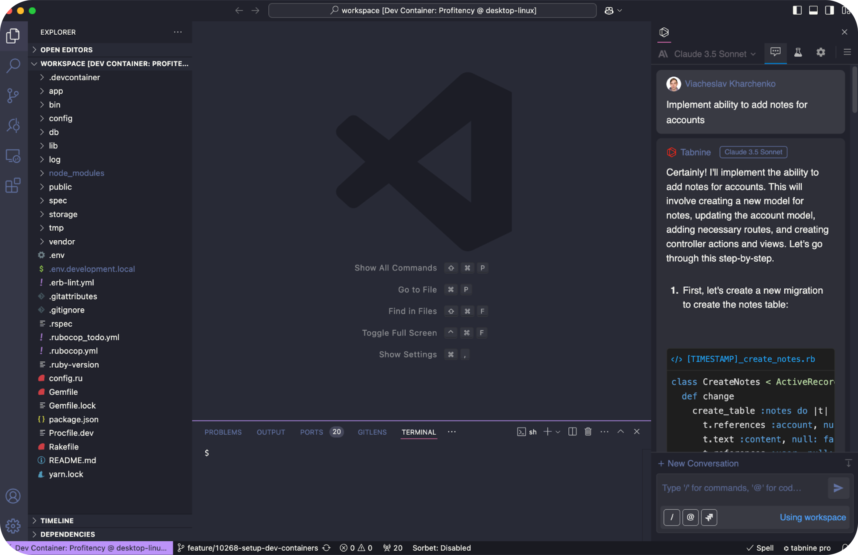 In Tabnine with Claude 3.5 Sonnet, I insert a request to use Dev Containers.