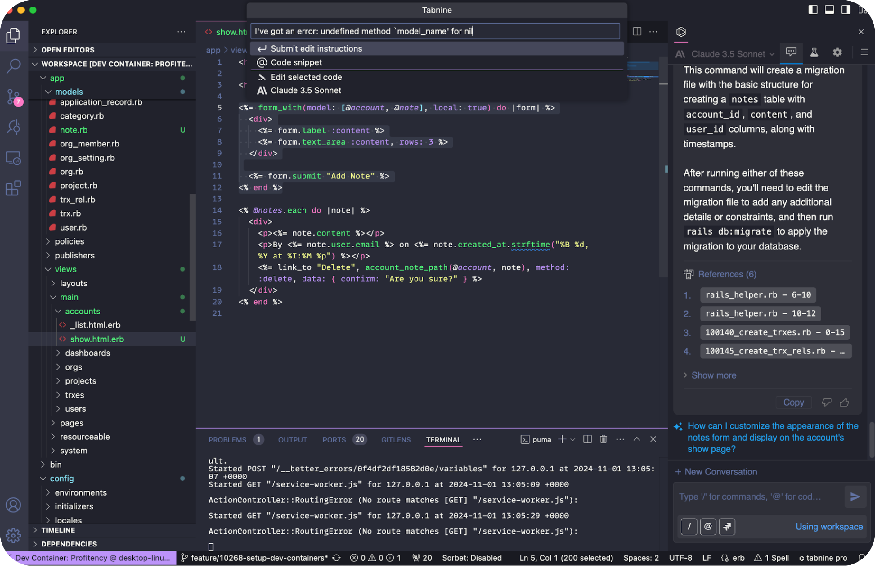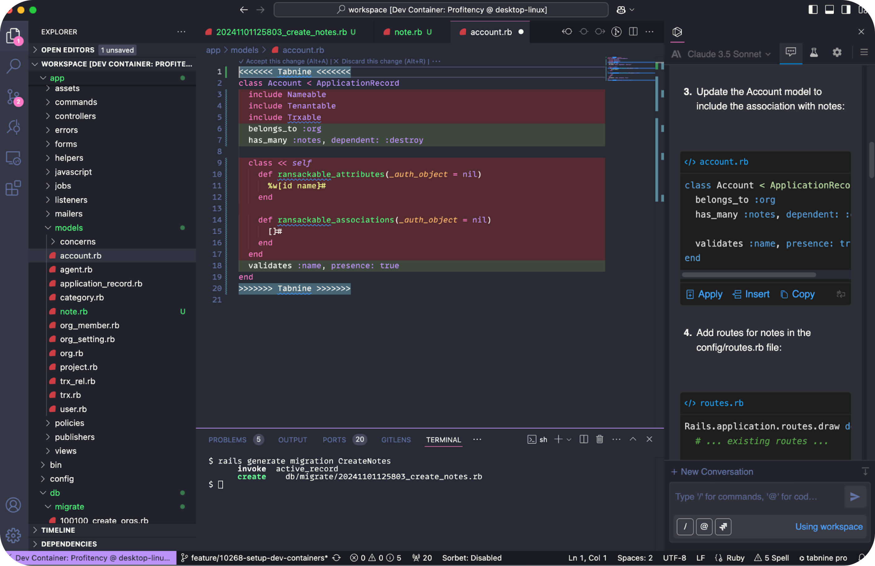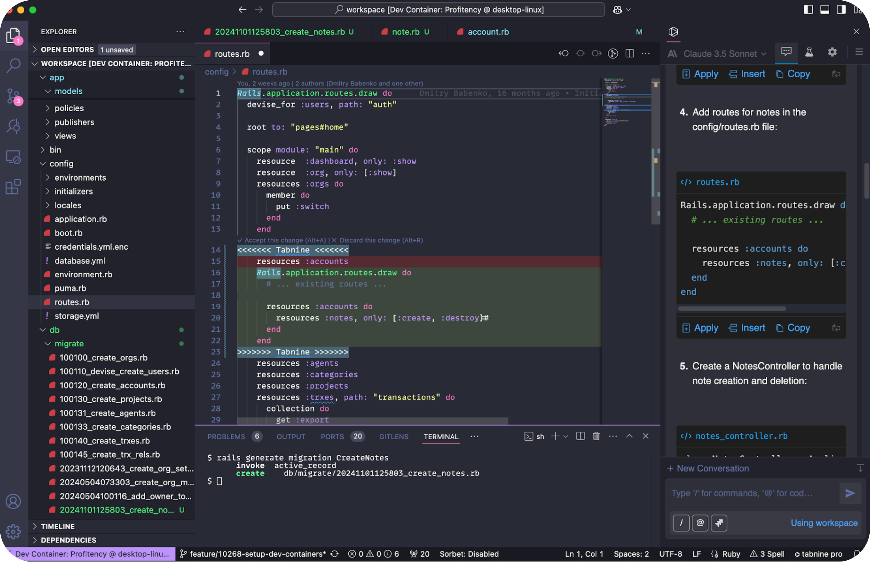 In Tabnine with Claude 3.5 Sonnet, I insert a request to use Dev Containers.