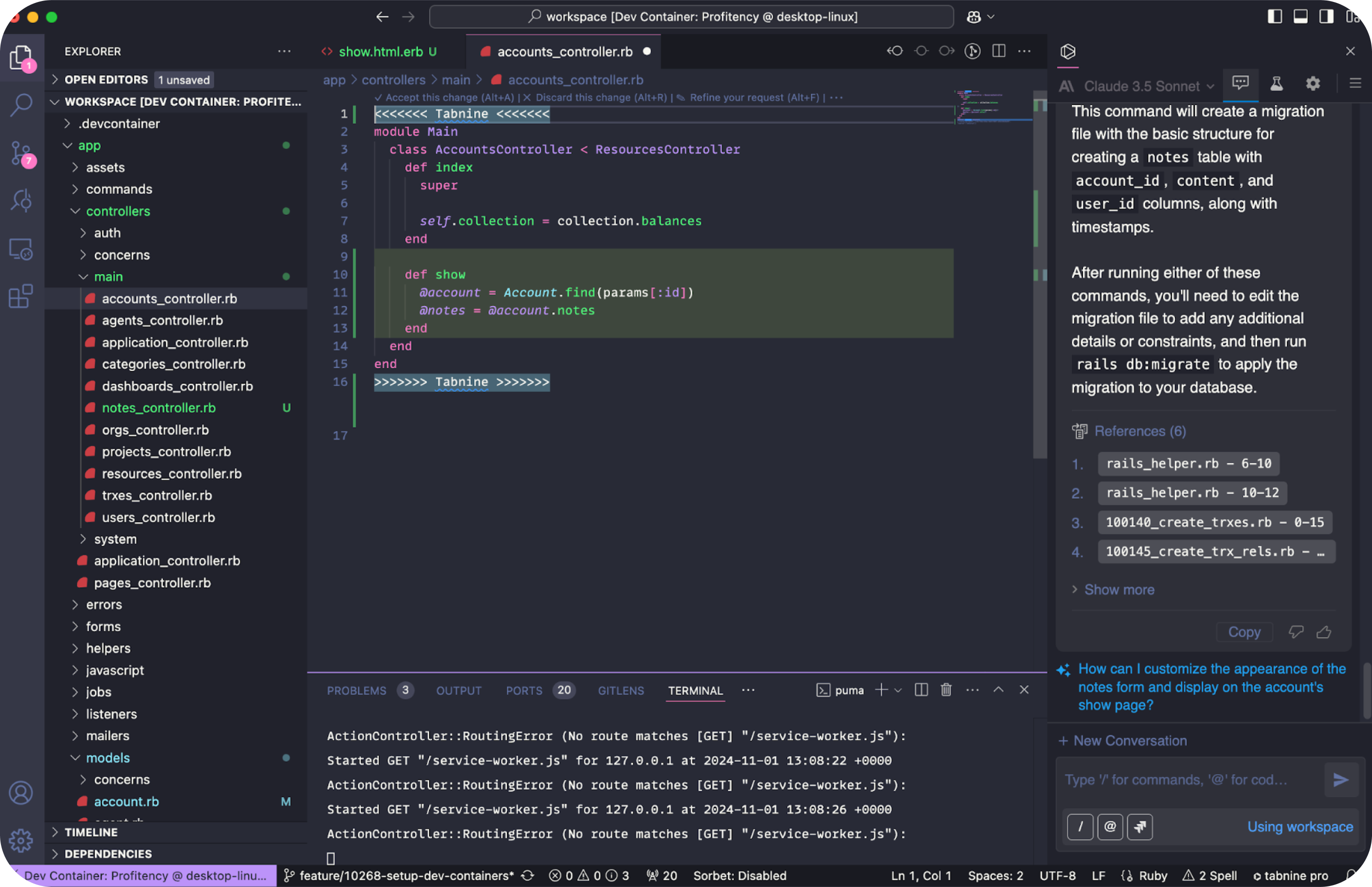 The usage of Tabnine was easier because it creates necessary files with proper names and locations. But in VS Code, after opening the app in the Dev Container, it turns off Tabnine's extension, and it needs to be installed and logged in manually once again. I think it's a limitation of VS Code and not connected with Tabnine.