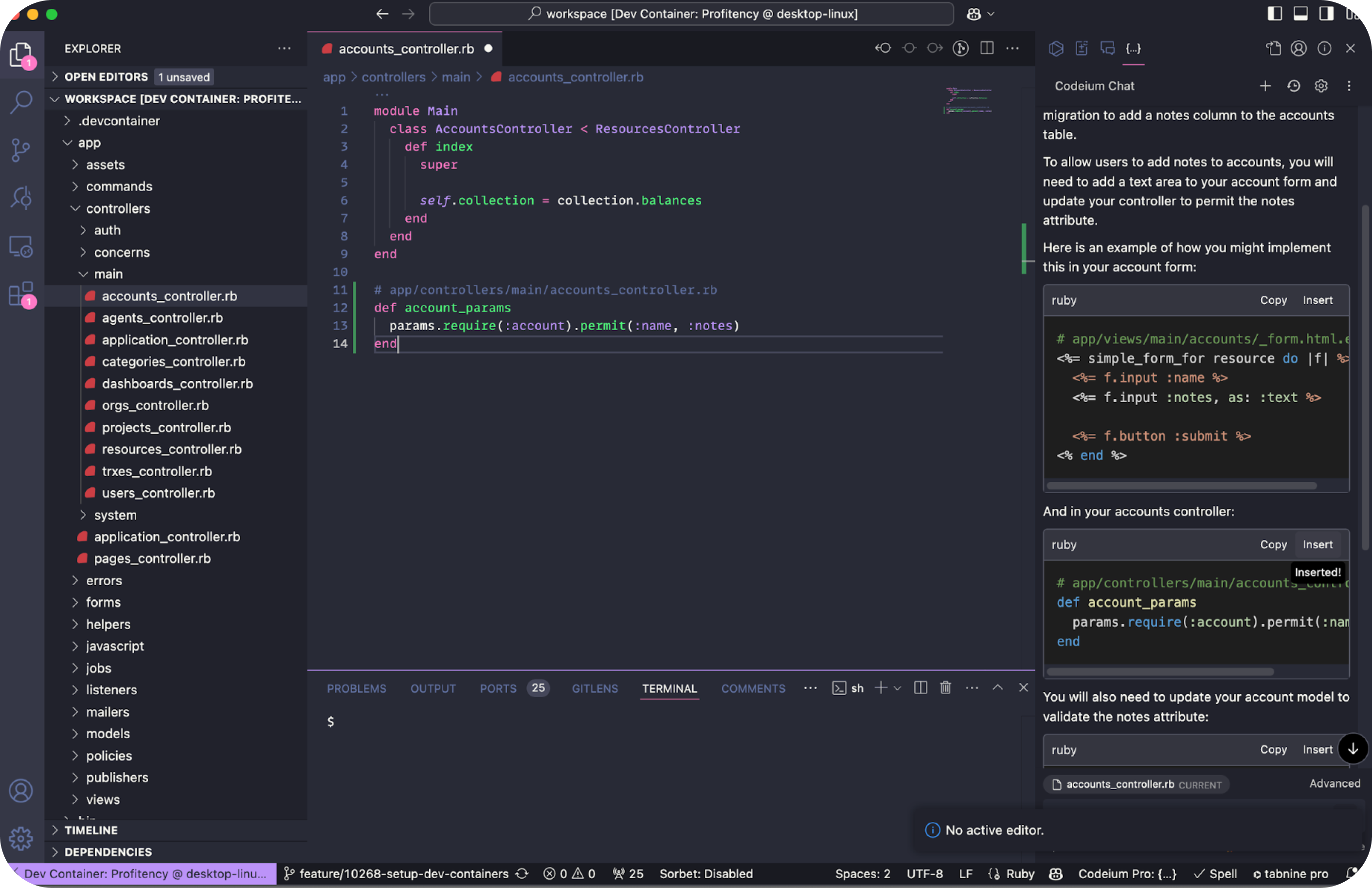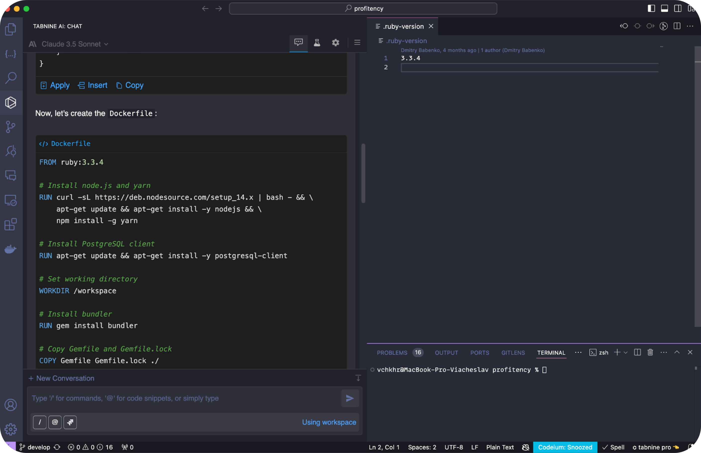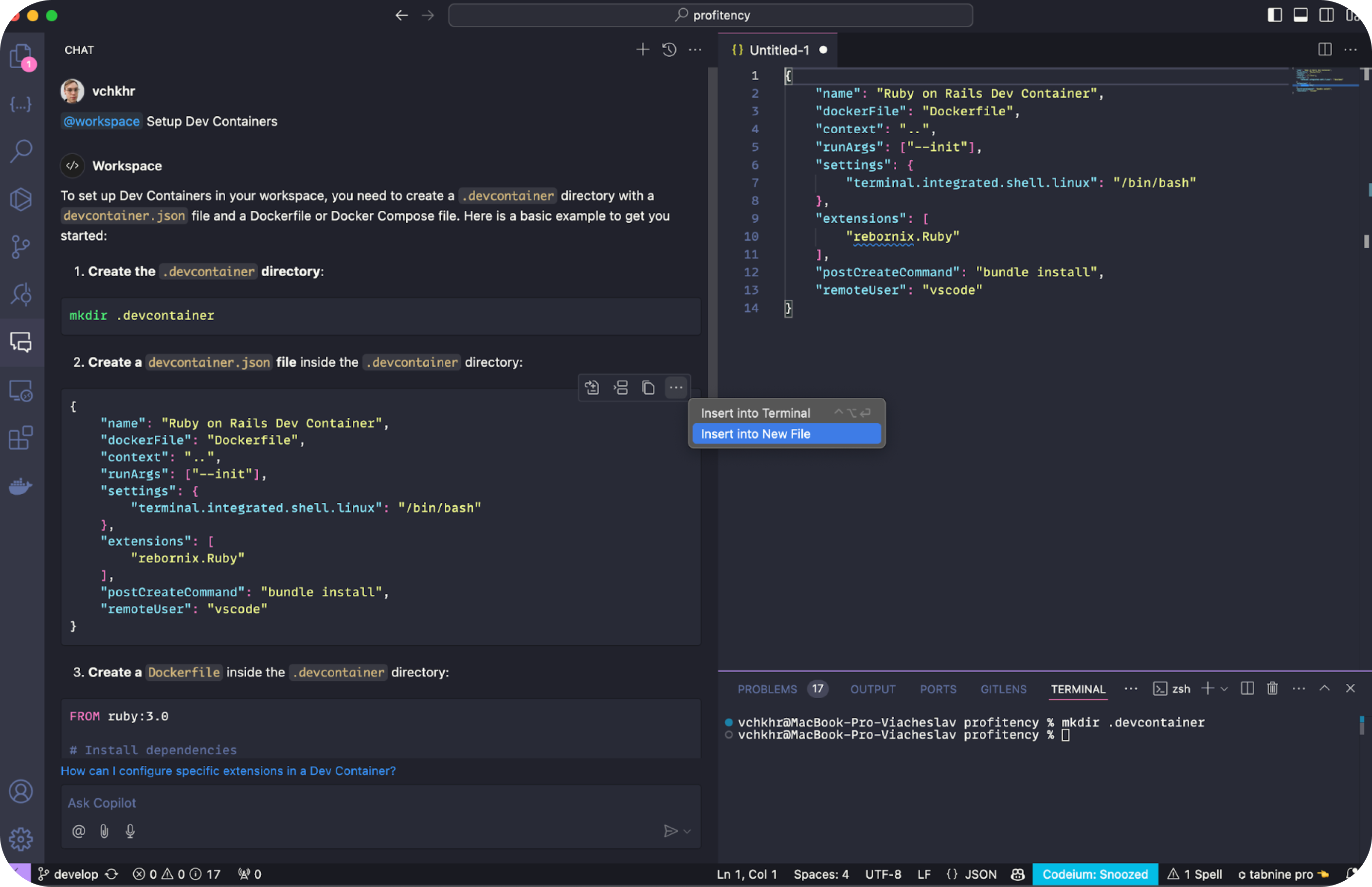 I ask to set up Dev Containers. The Ruby version is slightly inconsistent, but I’m more concerned about the lack of a Dockerfile. The "Insert" button simply inserts the contents where your cursor is.