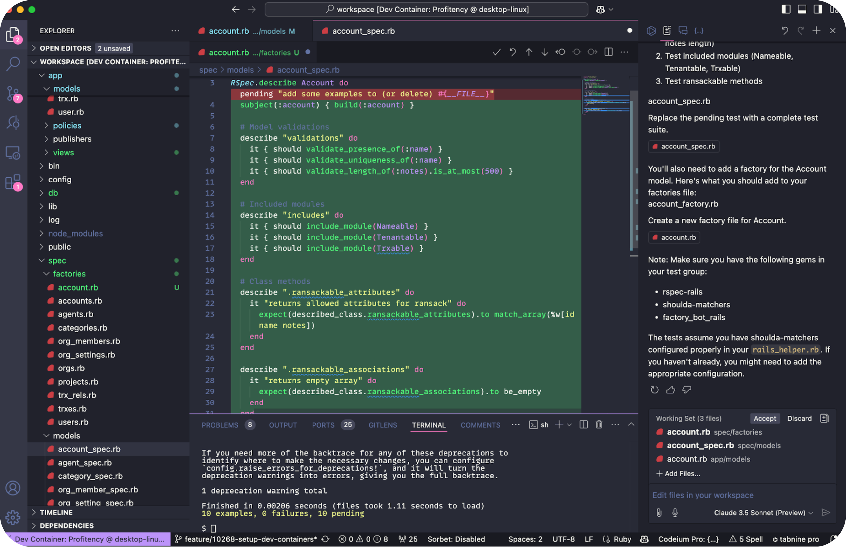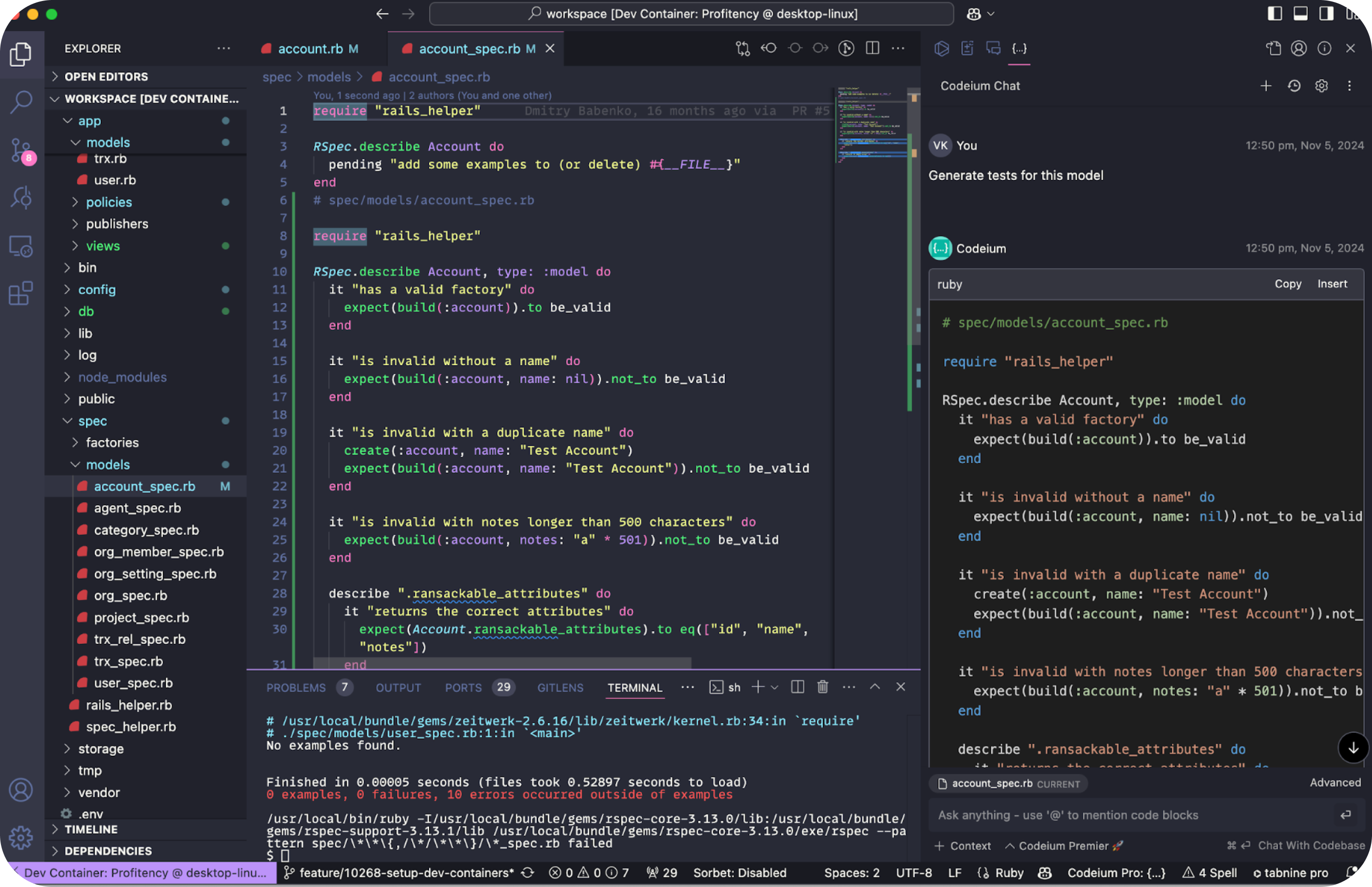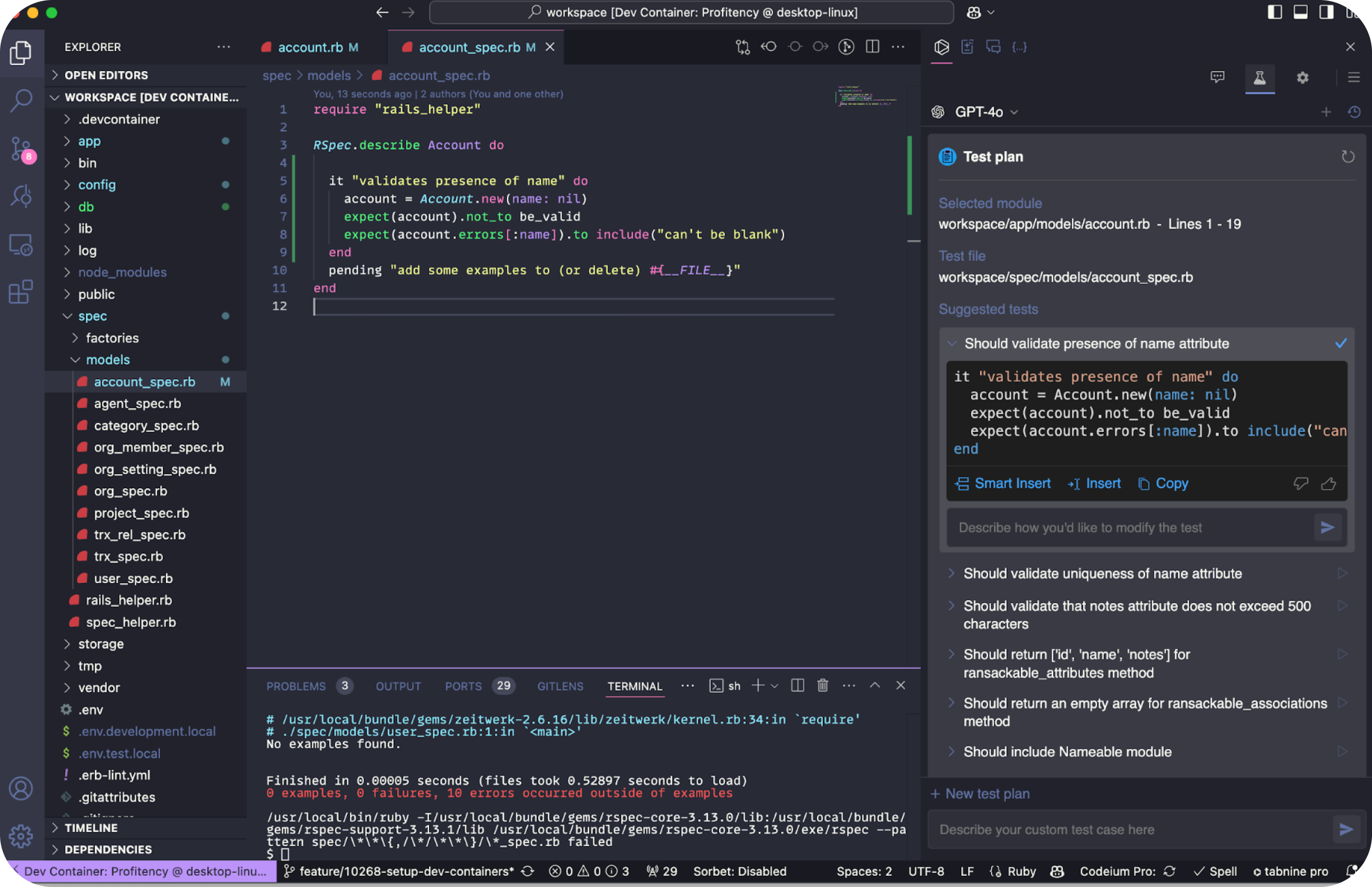 After adding some validations to the Account model, I asked the assistants to generate tests for it. Although many tests are typical, writing tests often takese considerable time for developerl. Utilizing AI assistants here can save significant time.