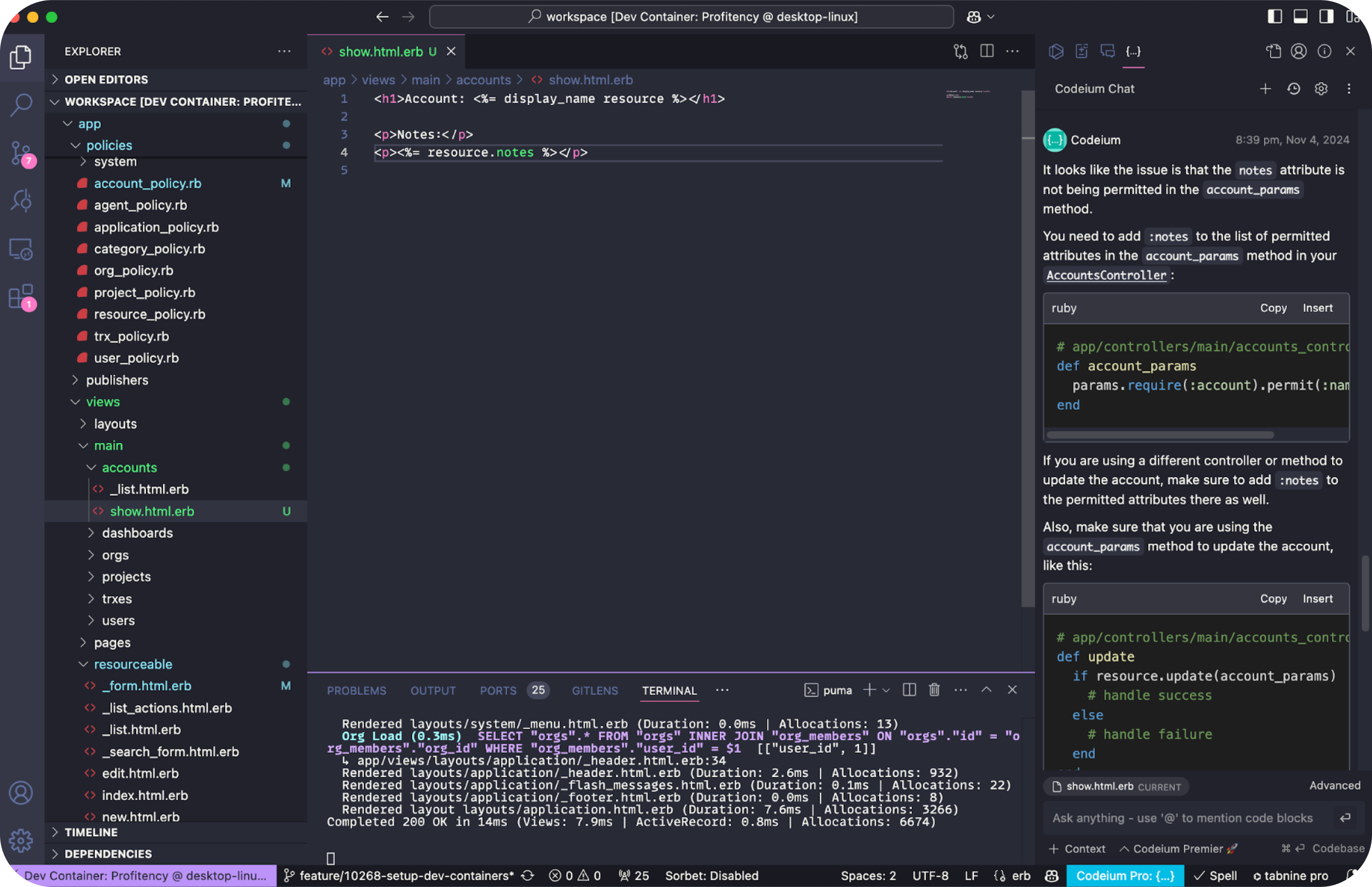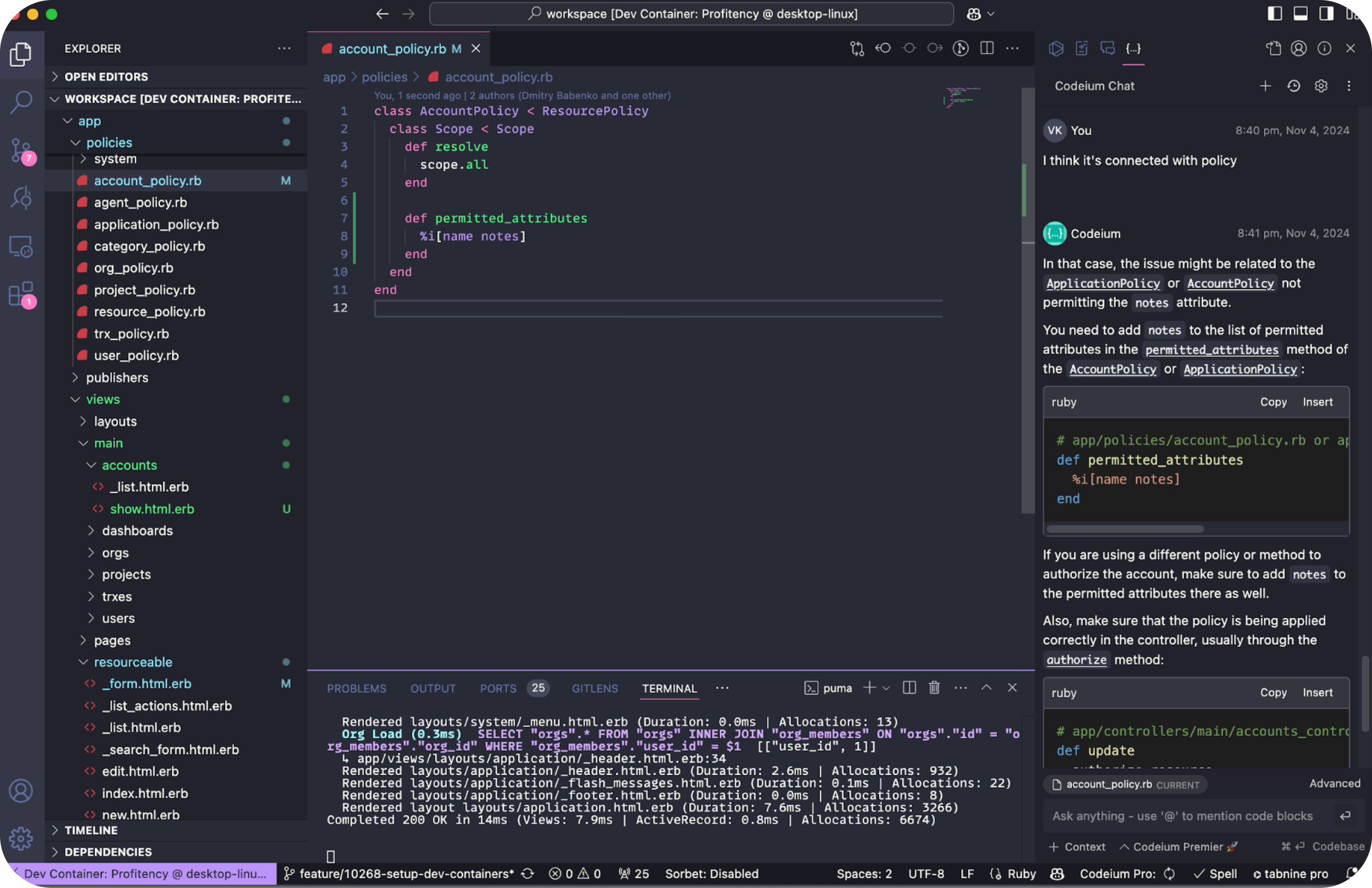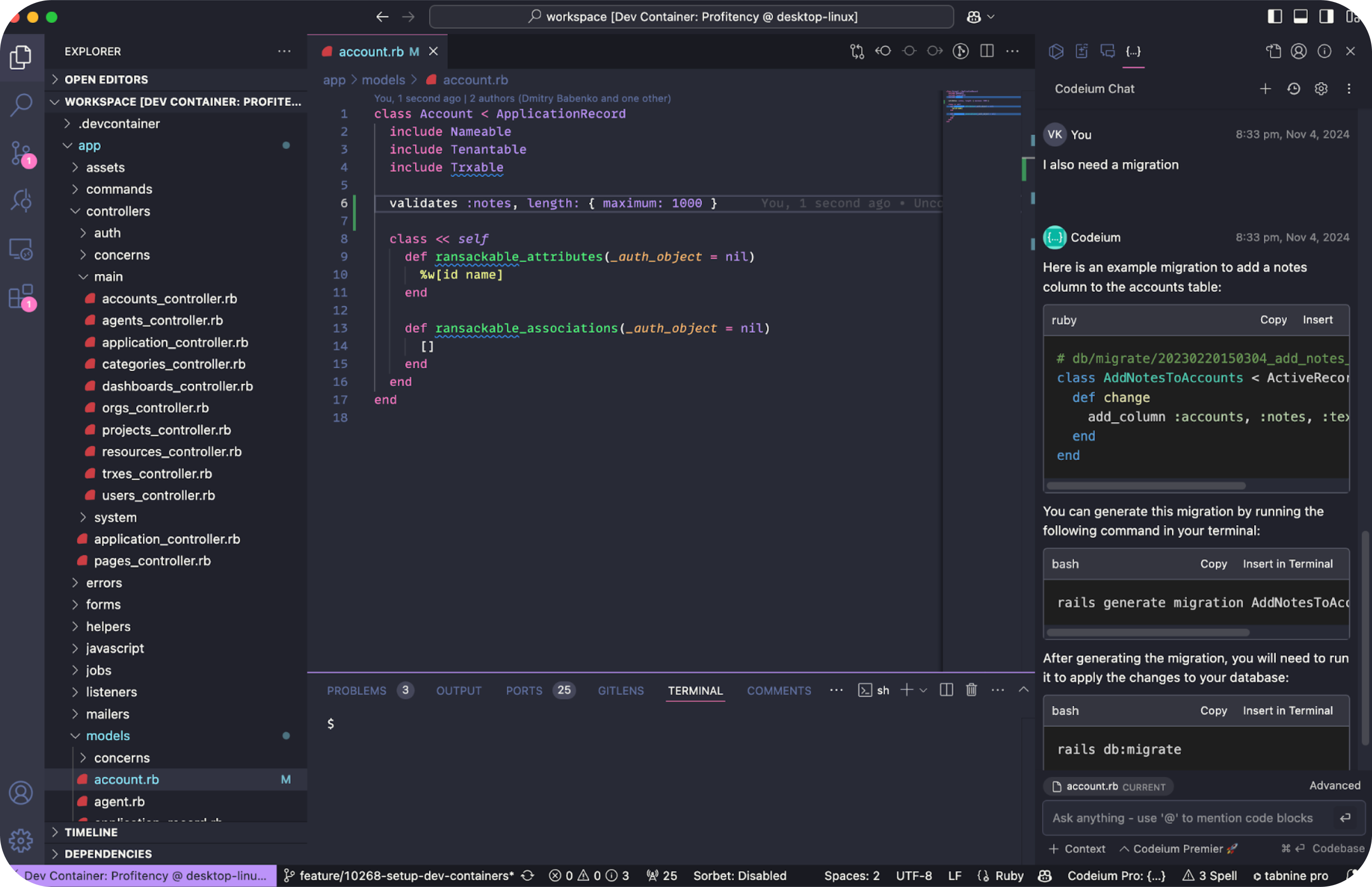 After adding some validations to the Account model, I asked the assistants to generate tests for it. Although many tests are typical, writing tests often takese considerable time for developerl. Utilizing AI assistants here can save significant time.