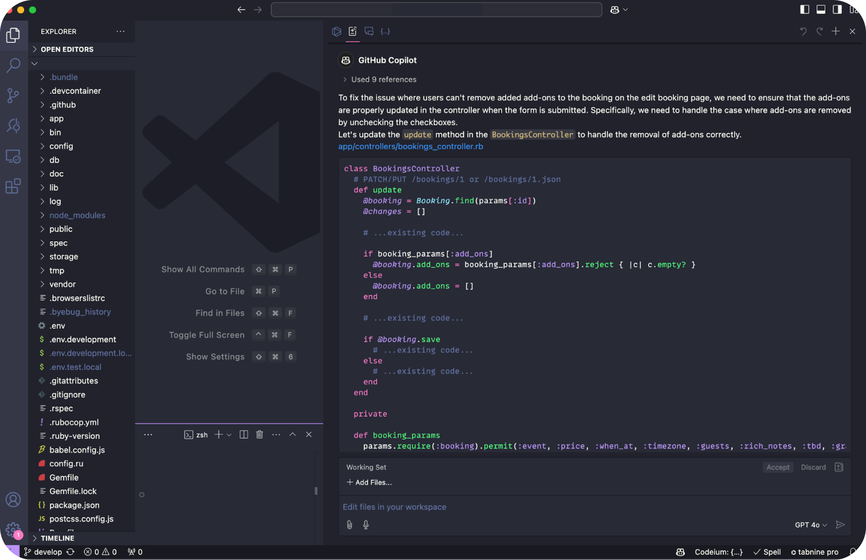 We asked GPT-4o to implement a feature for adding notes and attached the project’s codebase. This is done by including @workspace in the prompt or clicking the "Attach" button and selecting "Codebase."