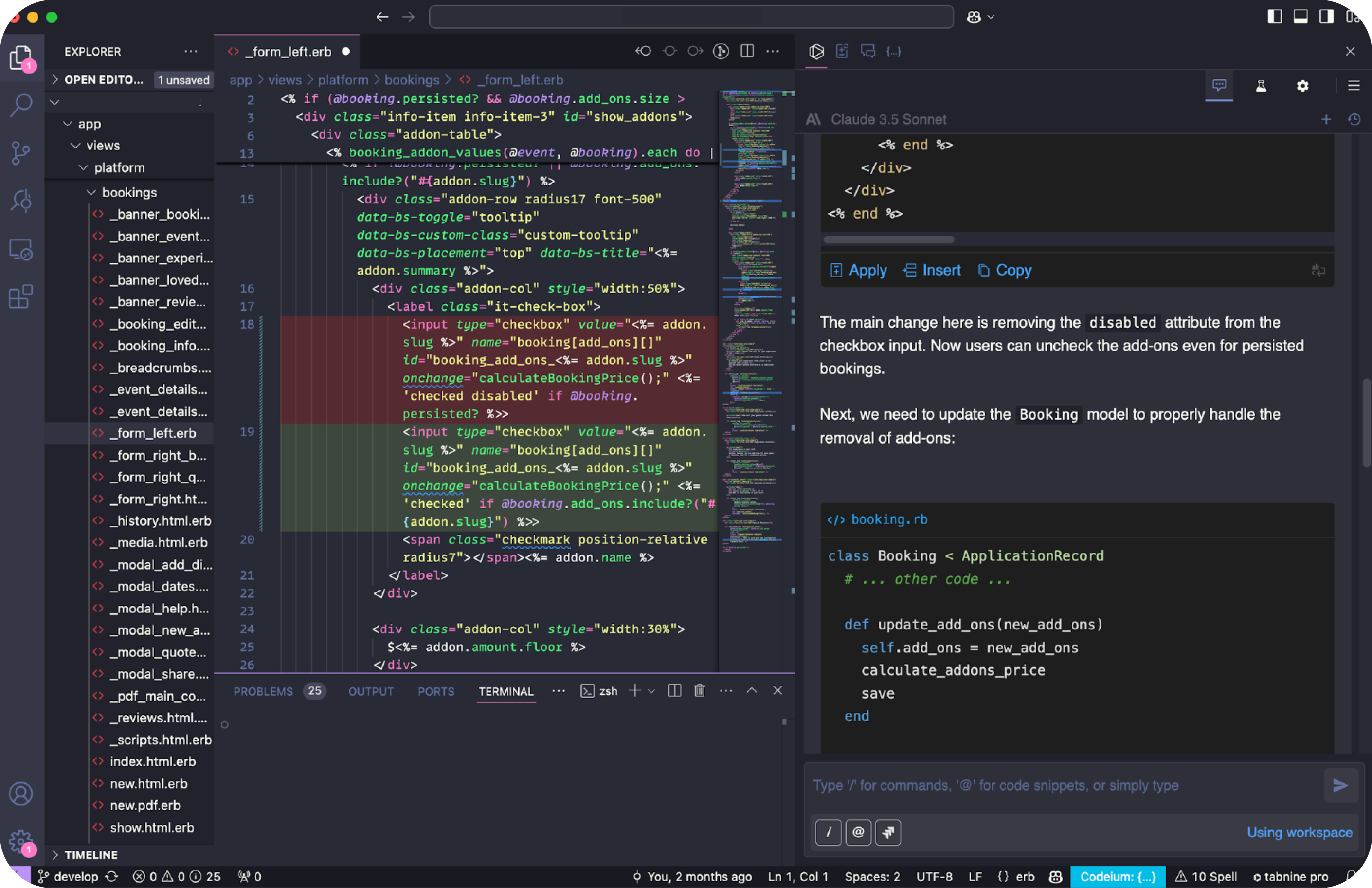 Clicking "Apply" isn’t an option this time, as the code is poorly-structured. However, file names are highlighted in blue, allowing me to open the relevant files directly. The solution included unnecessary steps, such as searching for an entity already handled in the controller. Additionally, some lines in the existing code needed removal, which GPT failed to address. The view file chosen for editing was incorrect, but the solution works if you know the correct file and apply GPT-4o’s changes to it.