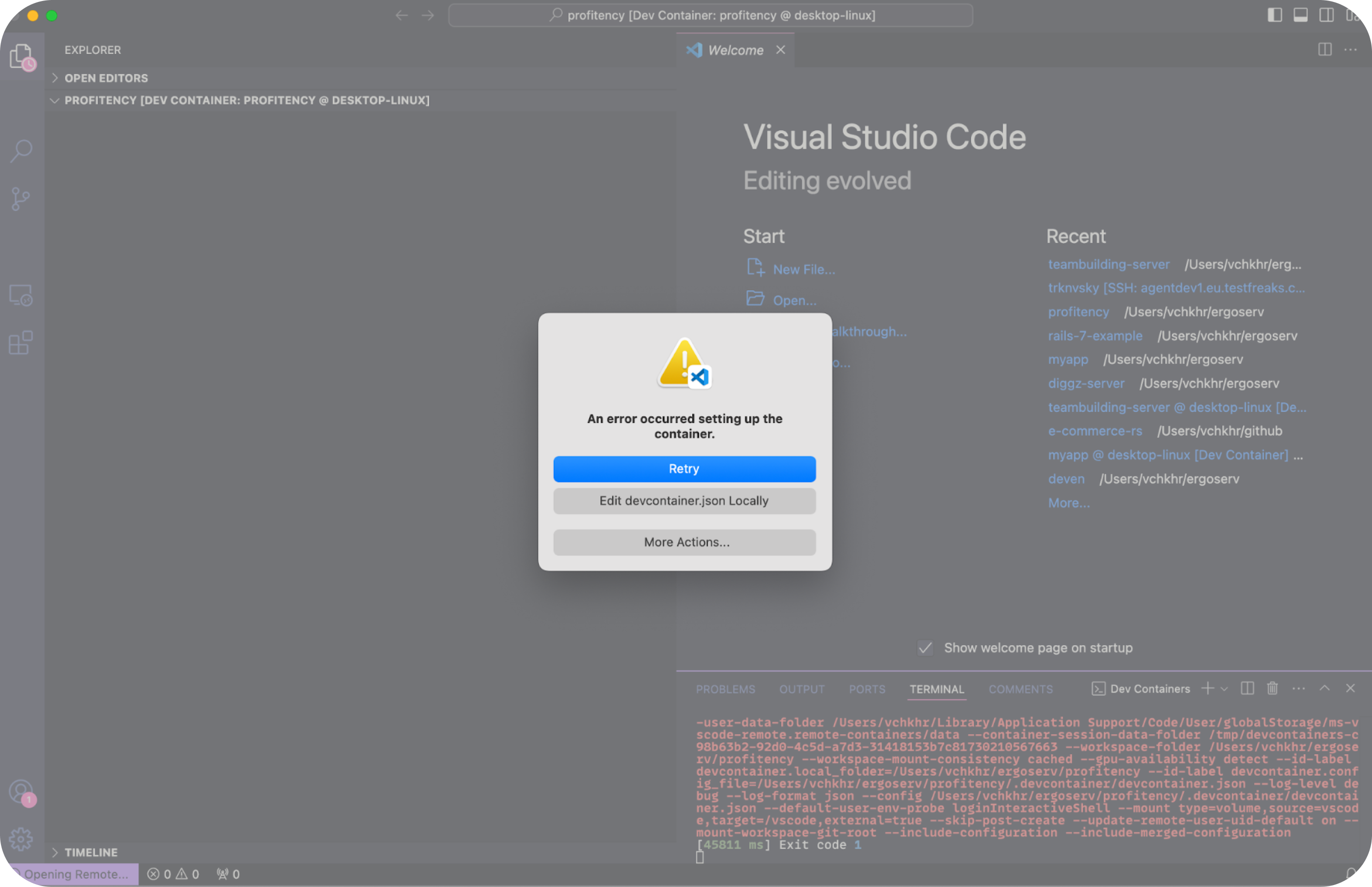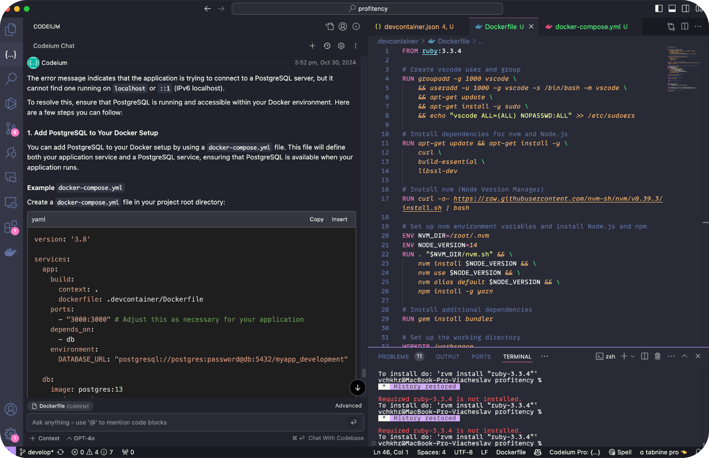 After about 10 attempts to fix the code using the instructions from o1-mini, the applicatimpossible to launch the Dev Containers application is in the PostgreSQL configuration, a typical task for setting up Ruby on Rails applications.